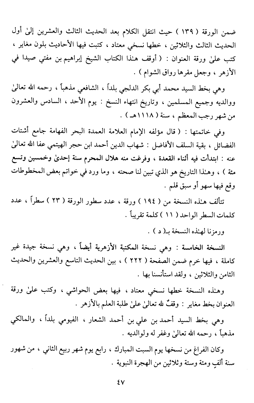 ضمن الورقة (139) حيث انتقل الكلام بعد الحديث الثالث والعشرين إلى أول الحديث الثالث والثلاثين، خطها نسخي معتاد، كتبت فيها الأحاديث بلون مغاير، كتب على ورقة العنوان: (أوقف هذا الكتاب الشيخ إبراهيم بن مفتي صيدا في الأزهر، وجعل مقرها رواق الشوام).