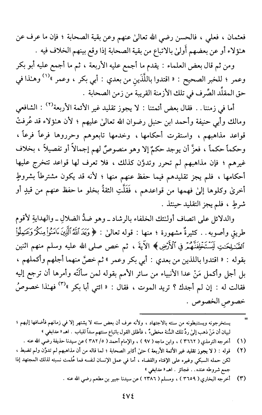 فعثمان، فعلي، فالحسن رضي اللَّه تعالى عنهم وعن بقية الصحابة؛ فإن ما عرف عن هؤلاء أو عن بعضهم أَولى بالاتباع من بقية الصحابة إذا وقع بينهم الخلاف فيه.