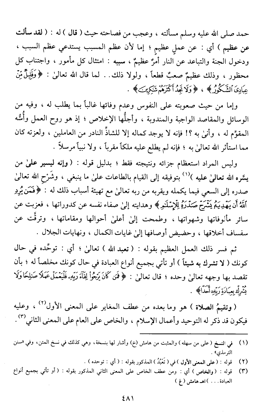 حمد صلي اللَّه عليه وسلم مسألته، وعجب من فصاحته حيث (قال) له: (لقد سألت عن عظيم) أي: عن عملٍ عظيمٍ؛ إما لأن عظم المسبب يستدعي عظم السبب، ودخول الجنة والتباعد عن النار أمرٌ عظيمٌ، سببه: امتثال كل مأمور، واجتناب كل محظور، وذلك عظيمٌ صعبٌ قطعًا، ولولا ذلك. . لما قال اللَّه تعالى: {وَقَلِيلٌ مِنْ عِبَادِيَ الشَّكُورُ}، {وَلَا تَجِدُ أَكْثَرَهُمْ شَاكِرِينَ}.