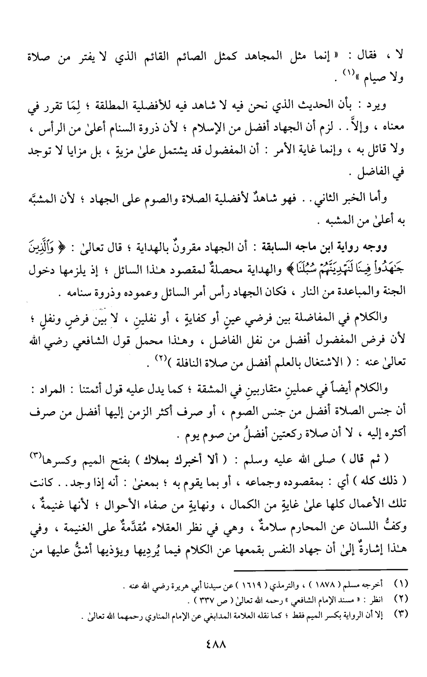 وأما الخبر الثاني. . فهو شاهدٌ لأفضلية الصلاة والصوم على الجهاد؛ لأن المشبَّه به أعلى من المشبه.