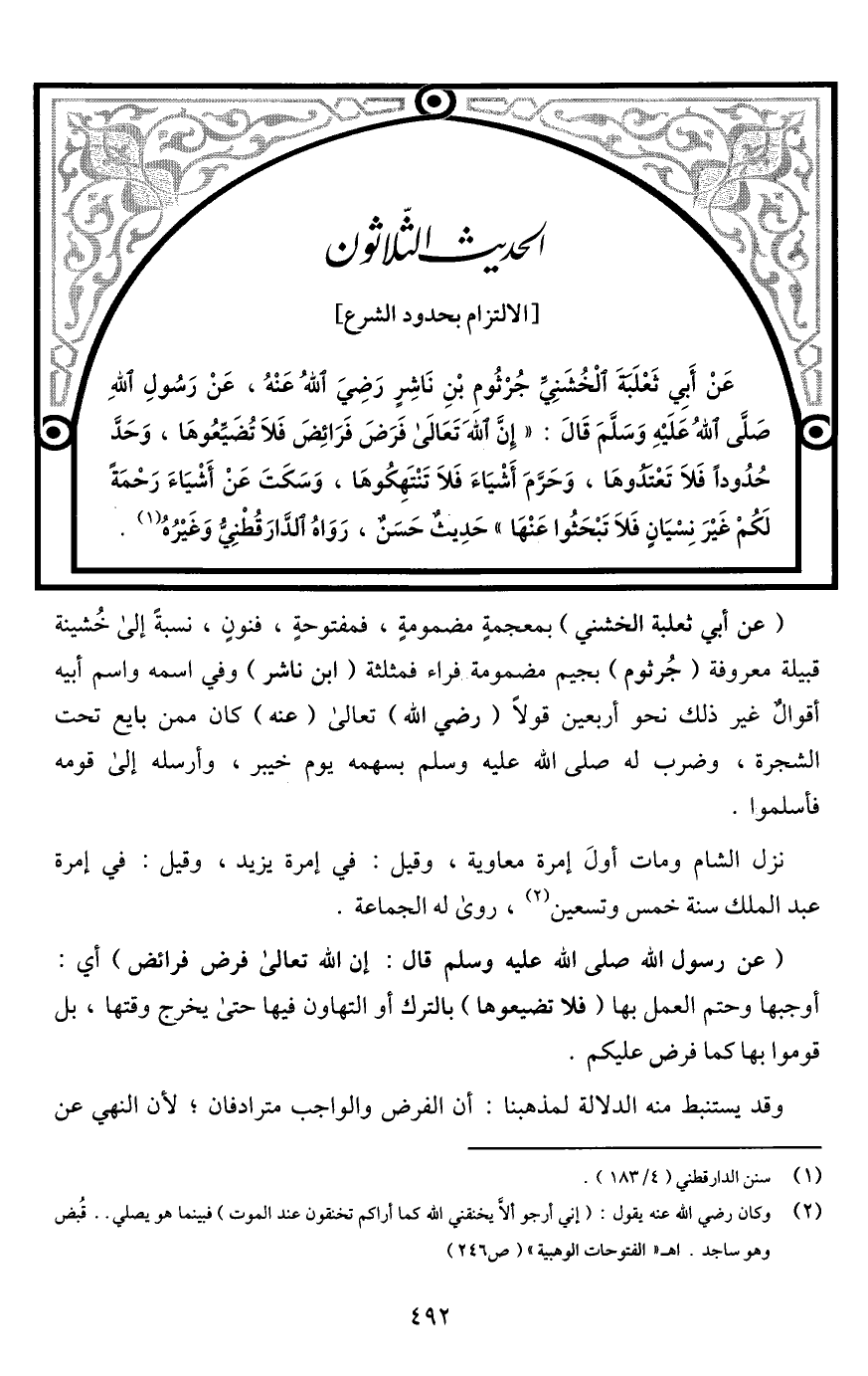 عَنْ أَبِي ثَعْلَبَةَ الْخُشَنِيِّ جُرْثُومِ بْنِ نَاشِرٍ رَضِيَ اللَّهُ عَنْهُ، عنْ رَسُولِ اللَّهِ صَلَّى اللَّهُ عَلَيْهِ وَسَلَّمَ قَالَ: "إِنَّ اللَّهَ تَعَالَى فَرَضَ فَرَائِضَ فَلا تُضَيِّعُوهَا، وَحَدَّ حُدُودًا فَلا تَعْتَدُوهَا، وَحَرَّمَ أَشْيَاءَ فَلا تَنْتَهِكُوهَا، وَسَكَتَ عَنْ أَشْيَاءَ رَحْمَةً لَكُمْ غَيْرَ نِسْيَانٍ فلا تَبْحَثُوا عَنْهَا" حَدِيثٌ حَسَنٌ، رَوَاه الدَّارَقُطْنِيُّ وغَيرُهُ (¬1).