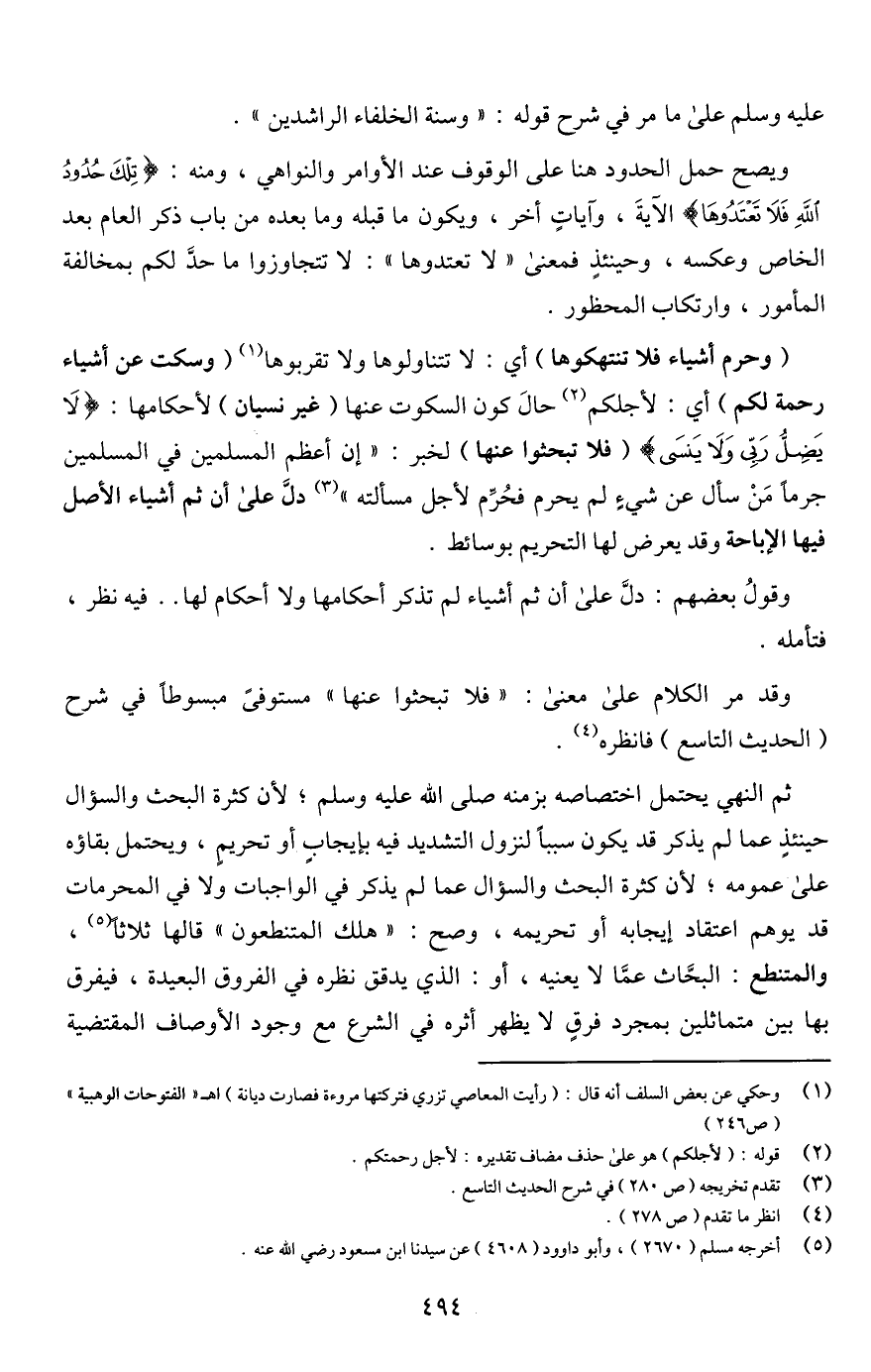 (وحرم أشياء فلا تنتهكوها) أي: لا تتناولوها ولا تقربوها (¬1) (وسكت عن أشياء رحمة لكم) أي: لأجلكم (¬2) حالَ كون السكوت عنها (غير نسيان) لأحكامها: {لَا يَضِلُّ رَبِّي وَلَا يَنْسَى} (فلا تبحثوا عنها) لخبر: "إن أعظم المسلمين في المسلمين جرمًا مَنْ سأل عن شيءٍ لم يحرم فحُرِّم لأجل مسألته" (¬3) دل على أن ثم أشياء الأصل فيها الإباحة وقد يعرض لها التحريم بوسائط.