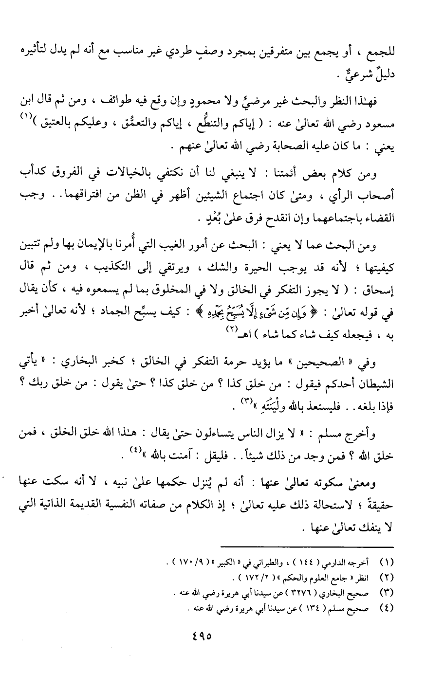 وفي "الصحيحين" ما يؤيد حرمة التفكر في الخالق؛ كخبر البخاري: "يأتي الشيطان أحدكم فيقول: من خلق كذا؟ من خلق كذا؟ حتى يقول: من خلق ربك؟ فإذا بلغه. . فليستعذ باللَّه ولْيَنْتَهِ" (¬3).