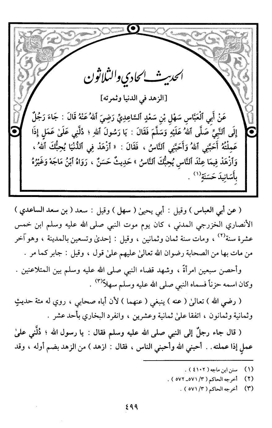 عَنْ أَبِي الْعَبَّاسِ سَهْلِ بْنِ سَعْدٍ السَّاعِدِيِّ رَضِيَ اللَّهُ عَنْهُ قَالَ: جَاءَ رَجُلٌ إِلَي النَّبِيِّ صَلَّى اللَّهُ عَلَيْهِ وَسَلَّمَ فَقَالَ: يَا رَسُولَ اللَّهِ؛ دُلَّنِي عَلَي عَمَلٍ إِذَا عَمِلْتُهُ أَحَبَّنِي اللَّهُ وَأَحَبَّنِي النَّاسُ, فَقَالَ: "ازْهَدْ فِي الدُّنْيَا يُحِبُّكَ اللَّهُ, وَازْهَدْ فِيمَا عِنْدَ النَّاسِ يُحِبُّكَ النَّاسُ" حَدِيثٌ حَسَنٌ, رَوَاهُ ابْنُ مَاجَه وَغَيْرُهُ بِأَسَانِيدَ حَسَنَةٍ (¬1).