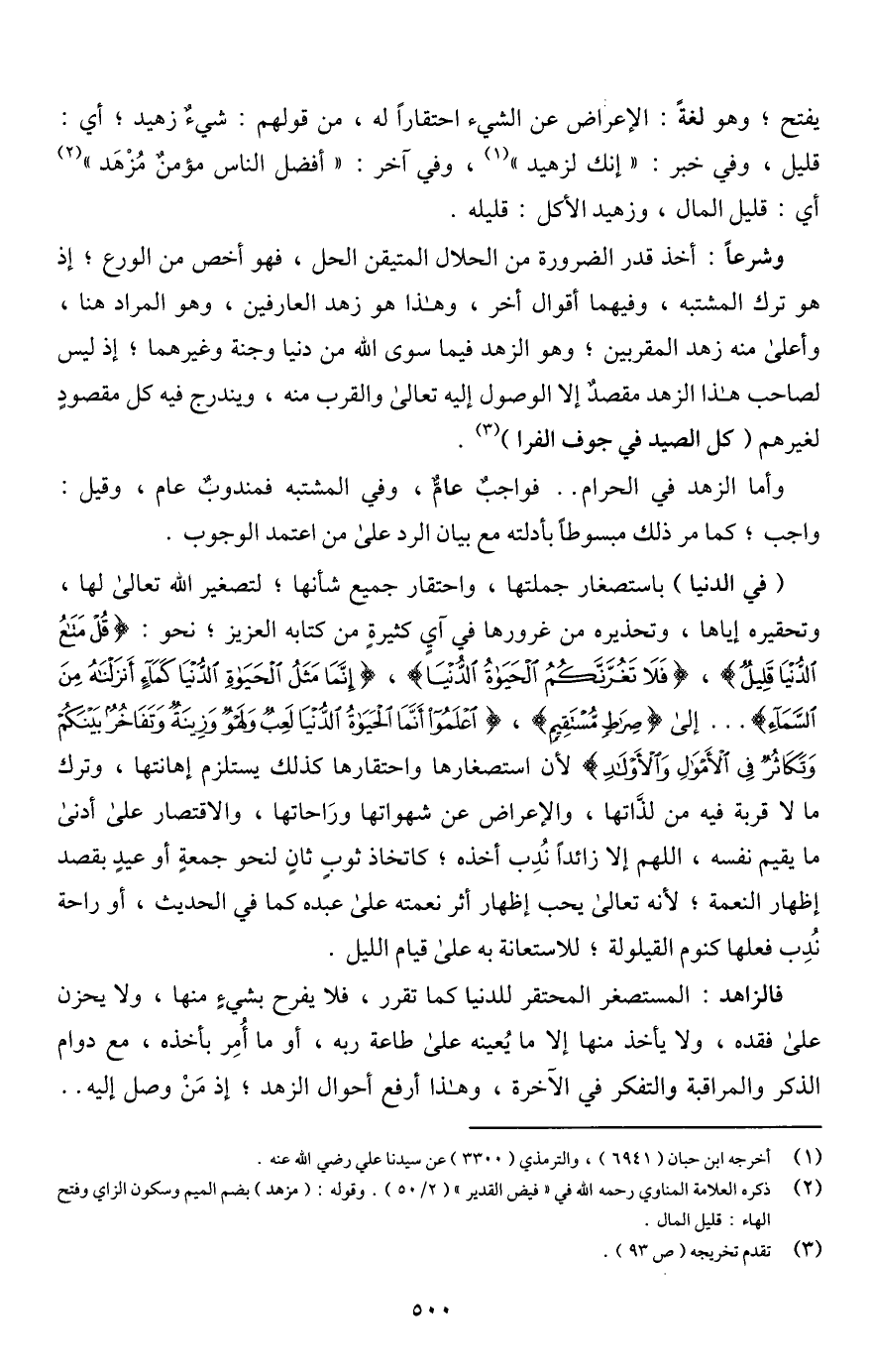 وشرعًا: أخذ قدر الضرورة من الحلال المتيقن الحل, فهو أخص من الورع؛ إذ هو ترك المشتبه، وفيهما أقوال أخر، وهذا هو زهد العارفين، وهو المراد هنا، وأعلى منه زهد المقربين؛ وهو الزهد فيما سوى اللَّه من دنيا وجنة وغيرهما؛ إذ ليس لصاحب هذا الزهد مقصدٌ إلا الوصول إليه تعالى والقرب منه، ويندرج فيه كل مقصودٍ لغيرهم (كل الصيد في جوف الفرا) (¬3).