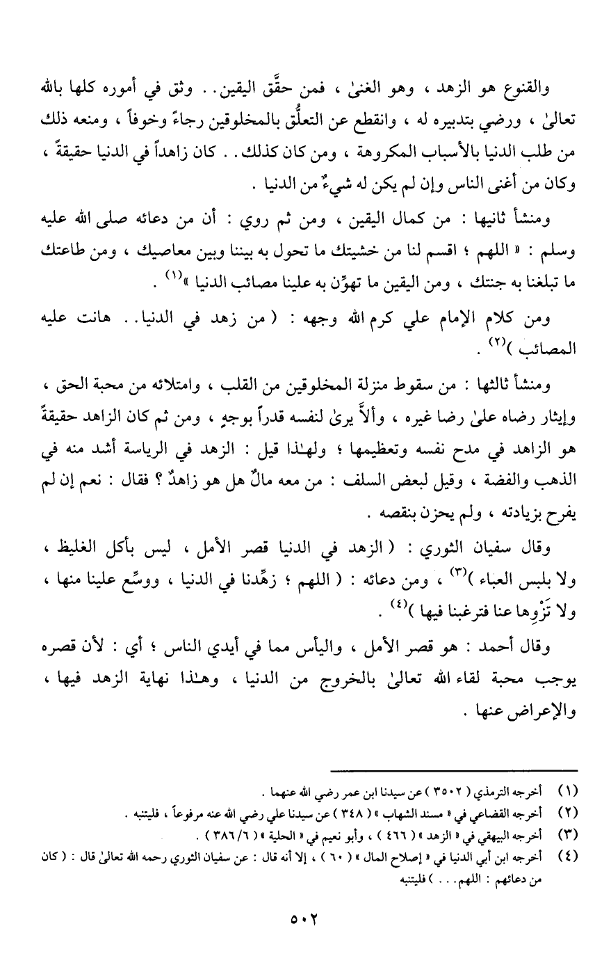 وقال سفيان الثوري: (الزهد في الدنيا قصر الأمل، ليس بأكل الغليظ، ولا بلبس العباء) (¬3)، ومن دعائه: (اللهم، زهِّدنا في الدنيا، ووسِّع علينا منها، ولا تَزْوِها عنا فترغبنا فيها) (¬4).