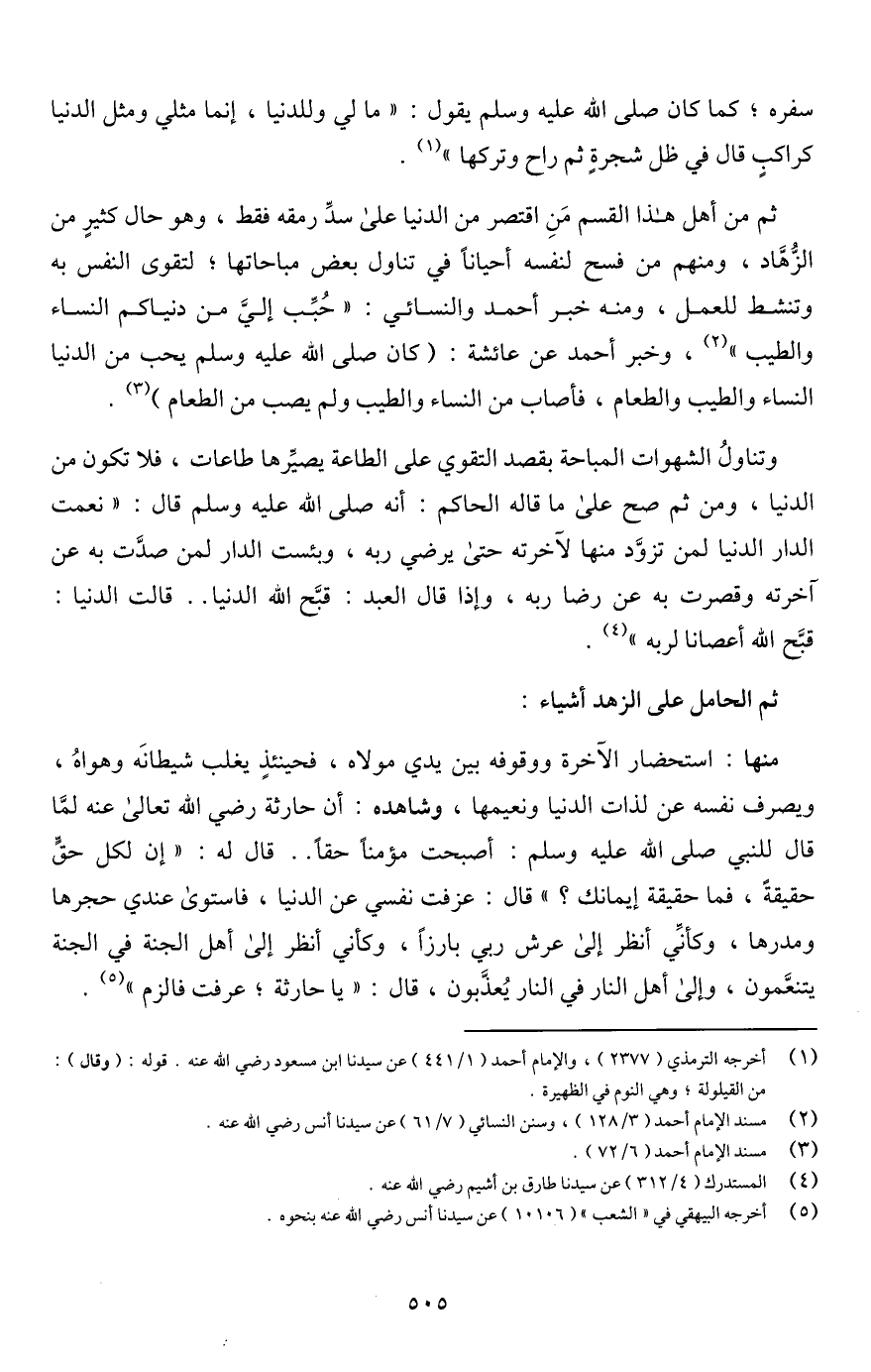 ثم من أهل هذا القسم مَنِ اقتصر من الدنيا على سدِّ رمقه فقط، وهو حال كثيرٍ من الزُّهَّاد، ومنهم من فسح لنفسه أحيانًا في تناول بعض مباحاتها، لتقوى النفس به وتنشط للعمل، ومنه خبر أحمد والنسائي: "حُبِّب إليَّ من دنياكم النساء والطيب" (¬2)، وخبر أحمد عن عائشة: (كان صلى اللَّه عليه وسلم يحب من الدنيا النساء والطيب والطعام، فأصاب من النساء والطيب ولم يصب من الطعام) (¬3).