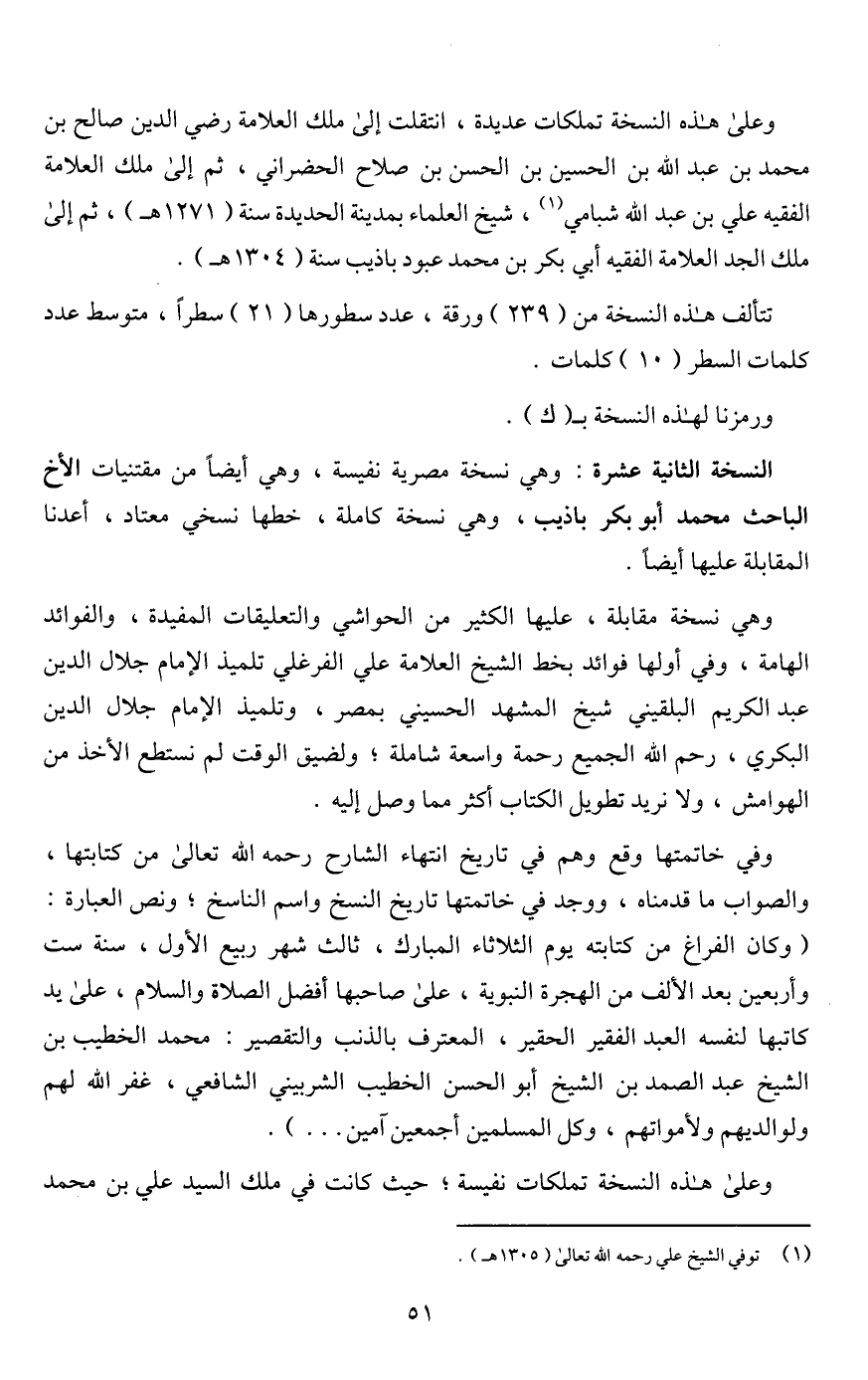 وهي نسخة مقابلة، عليها الكثير من الحواشي والتعليقات المفيدة، والفوائد الهامة، وفي أولها فوائد بخط الشيخ العلامة علي الفرغلي تلميذ الإمام جلال الدين عبد الكريم البلقيني شيخ المشهد الحسيني بمصر، وتلميذ الإمام جلال الدين البكري، رحم اللَّه الجميع رحمة واسعة شاملة؛ ولضيق الوقت لم نستطع الأخذ من الهوامش، ولا نريد تطويل الكتاب أكثر مما وصل إليه.