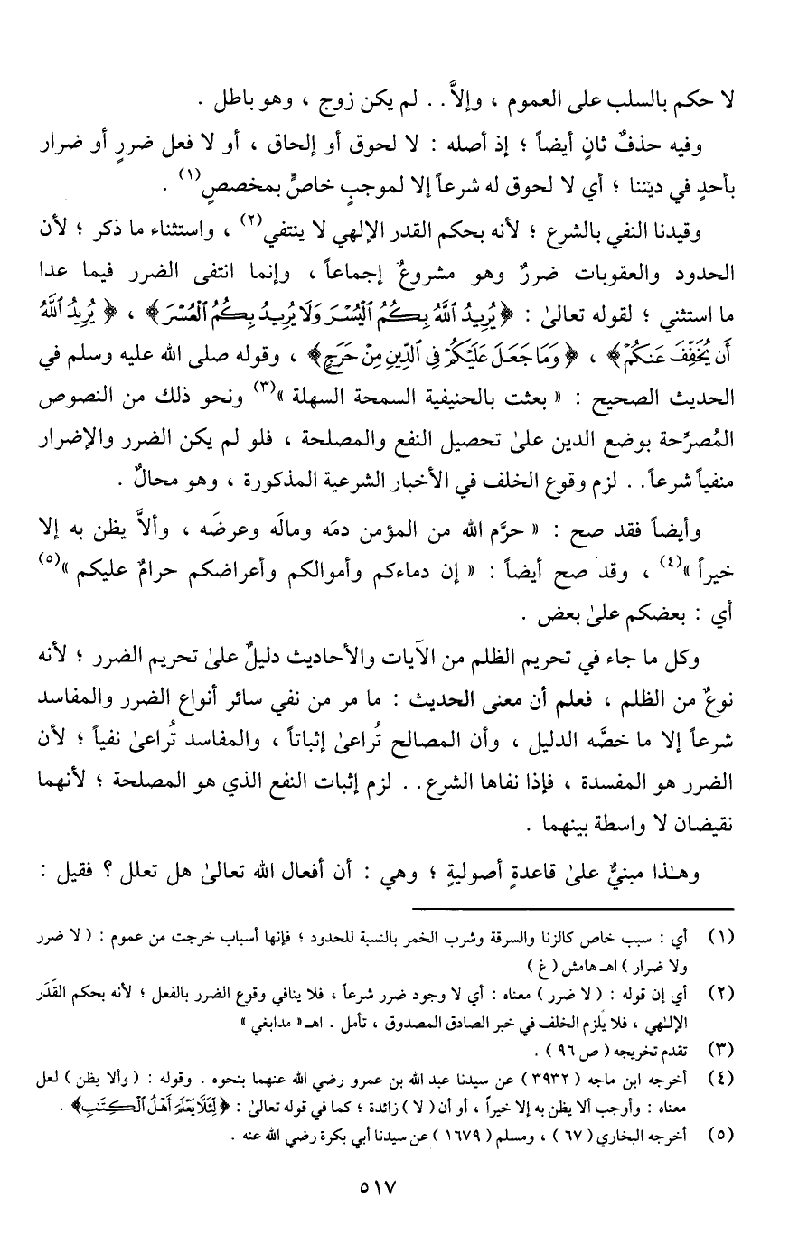 وكل ما جاء في تحريم الظلم من الآيات والأحاديث دليلٌ على تحريم الضرر؛ لأنه نوعٌ من الظلم، فعلم أن معنى الحديث: ما مر من نفي سائر أنواع الضرر والمفاسد شرعًا إلا ما خصَّه الدليل، وأن المصالح تُراعى إثباتًا، والمفاسد تُراعى نفيًا؛ لأن الضرر هو المفسدة، فإذا نفاها الشرع. . لزم إثبات النفع الذي هو المصلحة؛ لأنهما نقيضان لا واسطة بينهما.