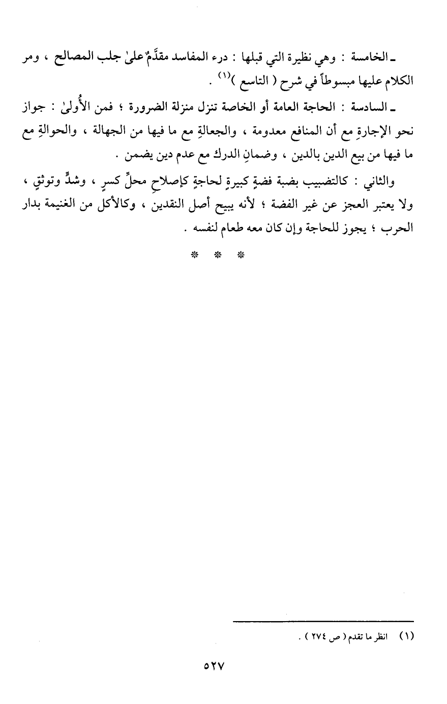 - السادسة: الحاجة العامة أو الخاصة تنزل منزلة الضرورة، فمن الأُولى: جواز نحو الإجارةِ مع أن المنافع معدومة، والجعالةِ مع ما فيها من الجهالة، والحوالةِ مع ما فيها من بيع الدين بالدين، وضمانِ الدرك مع عدم دين يضمن.