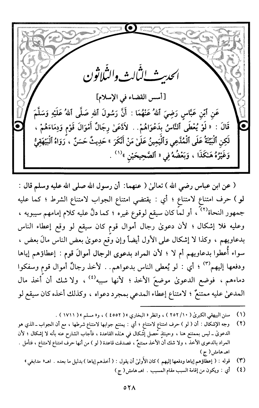 عنِ ابْنِ عَبَّاسٍ رَضِيَ اللَّهُ عَنْهُمَا: أَنَّ رَسُولَ اللَّهِ صَلَّى اللَّهُ عَلَيْهِ وَسَلَّمَ قَالَ: "لَوْ يُعْطَى النَّاسُ بِدَعْوَاهُمْ. . لادَّعَى رِجَالٌ أَمْوَالَ قَومٍ وَدِمَاءَهُمْ، لَكِنِ البَيِّنَةُ عَلَى المُدَّعِي وَاليَمِينُ عَلَى مَنْ أَنْكَرَ" حَدِيثٌ حَسَنٌ، رَوَاهُ البَيْهَقِيُّ وَغَيْرُهُ هَكَذَا، وَبَعْضُهُ فِي "الصَّحِيحَيْنِ" (¬1).