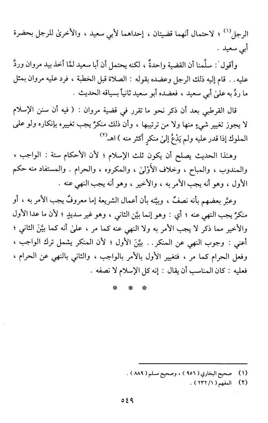 قال القرطبي بعد أن ذكر نحو ما تقرر في قضية مروان: (فيه أن سنن الإسلام لا يجوز تغيير شيءٍ منها ولا من ترتيبها، وأن ذلك منكرٌ يجب تغييره بإنكاره ولو على الملوك إذا قدر عليه ولم يَدْعُ إلى منكرٍ أكثر منه) اهـ (¬2)