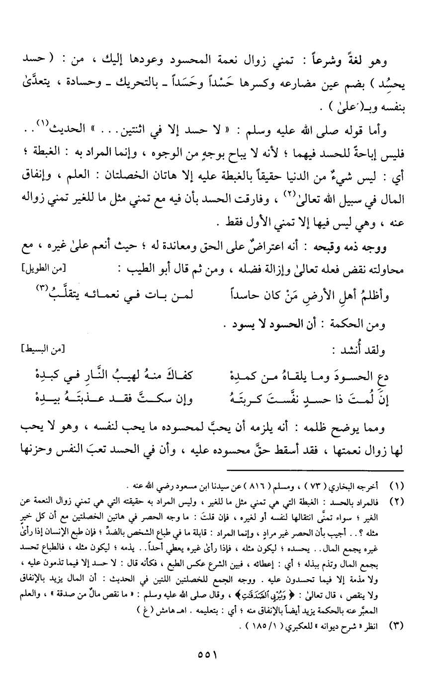 وأما قوله صلى اللَّه عليه وسلم: "لا حسد إلا في اثنتين. . . " الحديث (¬1). . فليس إباحةً للحسد فيهما؛ لأنه لا يباح بوجهٍ من الوجوه، وإنما المراد به: الغبطة؛ أي: ليس شيءٌ من الدنيا حقيقًا بالغبطة عليه إلا هاتان الخصلتان: العلم، وإنفاق المال في سبيل اللَّه تعالى (¬2)، وفارقت الحسد بأن فيه مع تمني مثل ما للغير تمني زواله عنه، وهي ليس فيها إلا تمني الأول فقط.