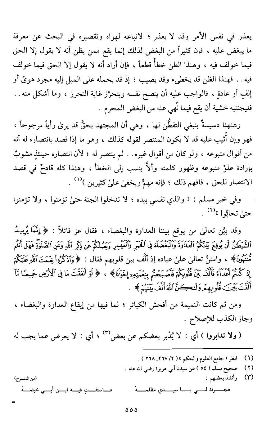 وقد بيَّن تعالى من يوقع بيننا العداوة والبغضاء، فقال عز قائلًا: {إِنَّمَا يُرِيدُ الشَّيْطَانُ أَنْ يُوقِعَ بَيْنَكُمُ الْعَدَاوَةَ وَالْبَغْضَاءَ فِي الْخَمْرِ وَالْمَيْسِرِ وَيَصُدَّكُمْ عَنْ ذِكْرِ اللَّهِ وَعَنِ الصَّلَاةِ فَهَلْ أَنْتُمْ مُنْتَهُونَ}، وامتنَّ تعالى على عباده إذ ألَّف بين قلوبهم فقال: {وَاذْكُرُوا نِعْمَتَ اللَّهِ عَلَيْكُمْ إِذْ كُنْتُمْ أَعْدَاءً فَأَلَّفَ بَيْنَ قُلُوبِكُمْ فَأَصْبَحْتُمْ بِنِعْمَتِهِ إِخْوَانًا}، {لَوْ أَنْفَقْتَ مَا فِي الْأَرْضِ جَمِيعًا مَا أَلَّفْتَ بَيْنَ قُلُوبِهِمْ وَلَكِنَّ اللَّهَ أَلَّفَ بَيْنَهُمْ}.