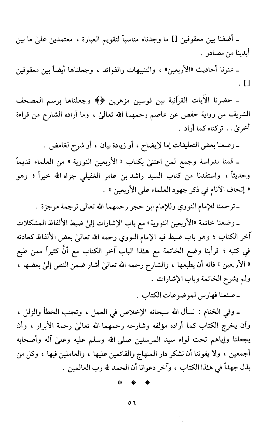 - وضعنا خاتمة "الأربعين النووية" مع باب الإشارات إلى ضبط الألفاظ المشكلات آخر الكتاب؛ وهو باب ضبط فيه الإمام النووي رحمه اللَّه تعالى بعض الألفاظ كعادته في كتبه؛ فرأينا وضع الخاتمة مع هذا الباب آخر الكتاب مع أنَّ كثيرًا ممن طبع "الأربعين" فاته أن يطبعها، والشارح رحمه اللَّه تعالى أشار ضمن النص إلى بعضها، ولم يشرح الخاتمة وباب الإشارات.