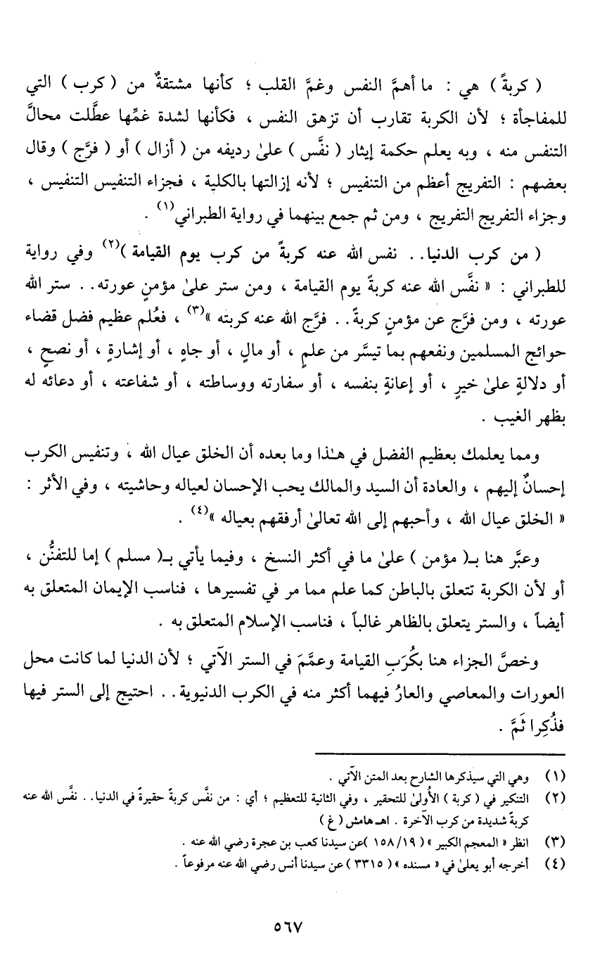 (¬2) التنكير في (كربة) الأُولى للتحقير، وفي الثانية للتعظيم؛ أي: من نفَّس كربةً حقيرةً في الدنيا. . نفس اللَّه عنه كربةً شديدة من كرب الآخرة. اهـ هامش (غ)