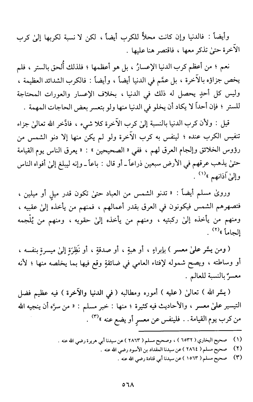 قيل: ولأن كرب الدنيا بالنسبة إلى كرب الآخرة كلا شيء، فادَّخر اللَّه تعالى جزاء تنفيس الكرب عنده؛ لينفس به كرب الآخرة ولو لم يكن منها إلا دنو الشمس من رؤوس الخلائق وإلجام العرق لهم، ففي "الصحيحين": "يعرق الناس يوم القيامة حتى يذهب عرقهم في الأرض سبعين ذراعًا -أو قال: باعًا- وإنه ليبلغ إلى أفواه الناس وإلى آذانهم" (¬1).