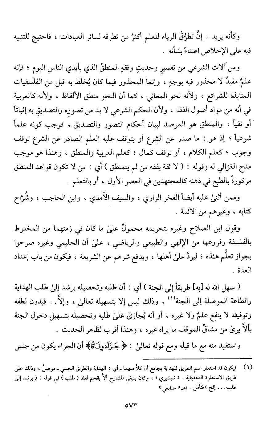 ومن آلات الشرعي من تفسيرٍ وحديثٍ وفقهٍ المنطقُ الذي بأيدي الناس اليوم؛ فإنه علمٌ مفيدٌ لا محذور فيه بوجهٍ، وإنما المحذور فيما كان يُخلط به قبل من الفلسفيات المنابذة للشرائع، ولأنه نحو المعاني، كما أن النحو منطق الألفاظ، ولأنه كالعربية في أنه من مواد أصول الفقه، ولأن الحكم الشرعي لا بد من تصورِه والتصديقِ به إثباتًا أو نفيًا، والمنطق هو المرصد لبيان أحكام التصور والتصديق، فوجب كونه علمًا شرعيًا؛ إذ هو: ما صدر عن الشرع أو يتوقف عليه العلم الصادر عن الشرع توقف وجوب؛ كعلم الكلام، أو توقف كمال؛ كعلم العربية والمنطق، وهذا هو موجب مدح الغزالي له وقوله: (لا ثقة بفقه من لم يتمنطق) أي: من لا تكون قواعد المنطق مركوزةً بالطبع في ذهنه كالمجتهدين في العصر الأول، أو بالتعلم.