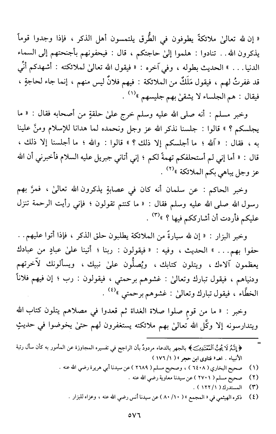 وخبر مسلم: أنه صلى اللَّه عليه وسلم خرج على حلقةٍ من أصحابه فقال: "ما يجلسكم؟ " قالوا: جلسنا نذكر اللَّه عز وجل ونحمده لما هدانا للإسلام ومنَّ علينا به، فقال: "آللَّه؛ ما أجلسكم إلا ذلك؟ " قالوا: واللَّه؛ ما أجلسنا إلا ذلك، قال: "أما إني لم أستحلفكم تهمةً لكم؛ إني أتاني جبريل عليه السلام فأخبرني أن اللَّه عز وجل يباهي بكم الملائكة" (¬2).