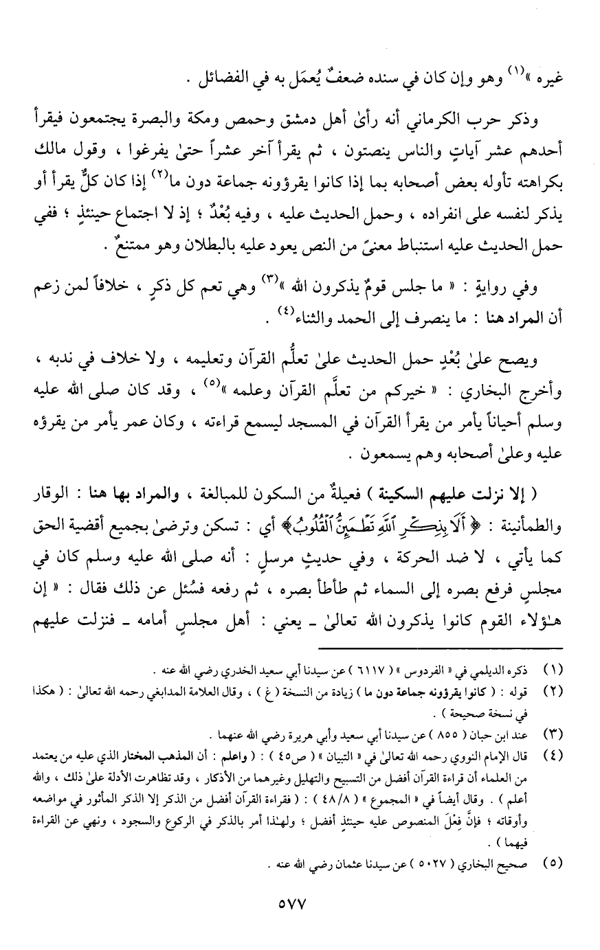 (¬4) قال الإمام النووي رحمه اللَّه تعالى في "التبيان" (ص 45): (واعلم: أن المذهب المختار الذي عليه من يعتمد من العلماء أن قراءة القرآن أفضل من التسبيح والتهليل وغيرهما من الأذكار، وقد تظاهرت الأدلة على ذلك، واللَّه أعلم). وقال أيضًا في "المجموع" (8/ 48): (فقراءة القرآن أفضل من الذكر إلا الذكر المأثور في مواضعه وأوقاته؛ فإن فِعْلَ المنصوص عليه حينئذٍ أفضل؛ ولهذا أمر بالذكر في الركوع والسجود، ونهي عن القراءة فيهما).