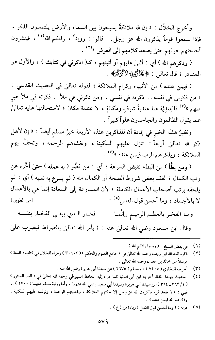 وأخرج الخلَّال: "إن للَّه ملائكةً يسيحون بين السماء والأرض يلتمسون الذكر، فإذا سمعوا قومًا يذكرون اللَّه عز وجل. . قالوا: رويدًا، زادكم اللَّه (¬1)، فينشرون أجنحتهم حولهم حتى يصعد كلامهم إلى العرش" (¬2).