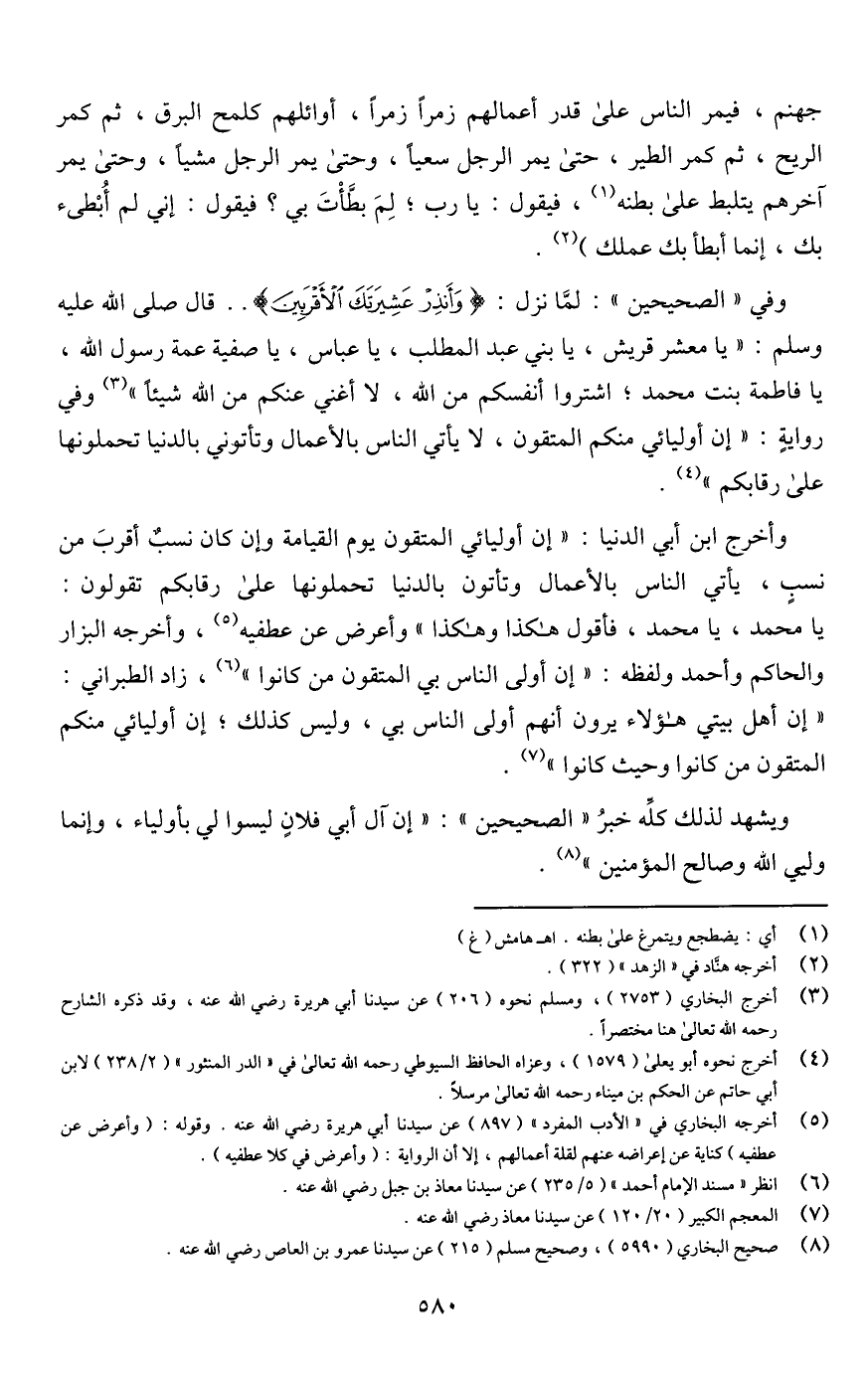 وفي "الصحيحين": لمَّا نزل: {وَأَنْذِرْ عَشِيرَتَكَ الْأَقْرَبِينَ}. . قال صلى اللَّه عليه وسلم: "يا معشر قريش، يا بني عبد المطلب، يا عباس، يا صفية عمة رسول اللَّه، يا فاطمة بنت محمد؛ اشتروا أنفسكم من اللَّه، لا أغني عنكم من اللَّه شيئًا" (¬3) وفي روايةٍ: "إن أوليائي منكم المتقون، لا يأتي الناس بالأعمال وتأتوني بالدنيا تحملونها على رقابكم" (¬4).