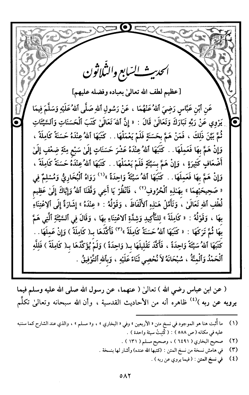 عَنِ ابْنِ عَبَّاسٍ رَضِيَ اللَّهُ عَنْهُمَا، عَنْ رَسُولِ اللَّهِ صَلَّى اللَّهُ عَلَيْهِ وَسَلَّمَ فِيمَا يَرْوِي عَنْ رَبِّهِ تَبَارَكَ وَتَعَالَى قَالَ: "إِنَّ اللَّهَ تَعَالَى كَتَبَ الْحَسَنَاتِ وَالسَّيِّئَاتِ ثُمَّ بَيَّنَ ذَلِكَ، فَمَنْ هَمَّ بِحَسَنَةٍ فَلَمْ يَعْمَلْهَا. . كَتبَهَا اللَّهُ عِنْدَهُ حَسَنَةً كَامِلَةً، وَإِنْ هَمَّ بِهَا فَعَمِلَهَا. . كَتَبَهَا اللَّهُ عِنْدَهُ عَشْرَ حَسَنَاتٍ إِلَى سَبْعِ مِئَةِ ضِعْفٍ إِلَى أَضْعَافِ كَثِيرَةٍ، وَإِنْ هَمَّ بِسَيِّئَةٍ فَلَمْ يَعْمَلْهَا. . كَتبَهَا اللَّهُ عِنْدَهُ حَسَنَةً كَامِلَةً، وَإِنْ هَمَّ بِهَا فَعَمِلَهَا. . كَتَبَهَا اللَّهُ سَيِّئَةً وَاحِدَةً" (¬1) رَوَاهُ الْبُخَارِيُّ وَمُسْلِمٌ فِي "صَحِيحَيْهِمَا" بِهَذِهِ الْحُرُوفِ (¬2)، فَانْظُرْ يَا أَخِي وَفَّقَنَا اللَّهُ وَإِيَّاكَ إِلَى عَظِيمِ لُطْفِ اللَّهِ تَعَالَى، وَتَأَمَّلْ هَذِهِ الأَلْفَاظَ، وَقَوْلُهُ: "عِنْدهُ" إِشَارَةٌ إِلَى الاعْتِنَاءِ بِهَا، وَقَوْلُهُ: "كَامِلَةً" لِلتَّأْكِيدِ وَشِدَّةِ الاعْتِنَاءِ بِهَا، وَقَالَ فِي السَّيِّئَةِ الَّتِي هَمَّ بِهَا ثُمَّ تَرَكَهَا: "كَتَبَهَا اللَّهُ حَسَنَةً كَامِلَةً" (¬3) فَأَكَّدَهَا بِـ (كَامِلَةً) وَإِنْ عَمِلَهَا كَتَبَهَا اللَّهُ سَيِّئَةً وَاحِدَةً، فَأَكَّدَ تَقْلِيلَهَا بِـ (وَاحِدَةً) وَلَمْ يُؤَكِّدْهَا بِـ (كَامِلَةً) فَلِلَّهِ الْحَمْدُ وَالْمِنَّةُ، سُبْحَانَهُ لَا نُحْصِي ثَنَاءً عَلَيْهِ، وَبِاللَّهِ التَّوْفِيقُ.