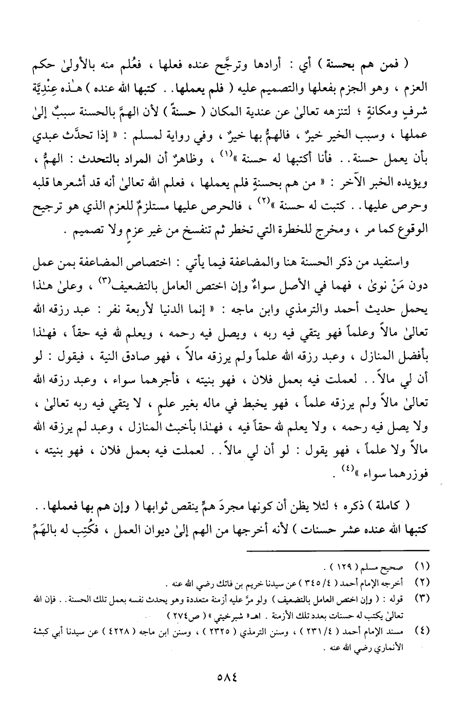 واستفيد من ذكر الحسنة هنا والمضاعفة فيما يأتي: اختصاص المضاعفة بمن عمل دون مَنْ نوى، فهما في الأصل سواءٌ وإن اختص العامل بالتضعيف (¬3)، وعلى هذا يحمل حديث أحمد والترمذي وابن ماجه: "إنما الدنيا لأربعة نفر: عبد رزقه اللَّه تعالى مالًا وعلمًا فهو يتقي فيه ربه، ويصل فيه رحمه، ويعلم للَّه فيه حقًا، فهذا بأفضل المنازل، وعبد رزقه اللَّه علمًا ولم يرزقه مالًا، فهو صادق النية، فيقول: لو أن لي مالًا. . لعملت فيه بعمل فلان، فهو بنيته، فأجرهما سواء، وعبد رزقه اللَّه تعالى مالًا ولم يرزقه علمًا، فهو يخبط في ماله بغير علمٍ، لا يتقي فيه ربه تعالى، ولا يصل فيه رحمه، ولا يعلم للَّه حقًا فيه، فهذا بأخبث المنازل، وعبد لم يرزقه اللَّه مالًا ولا علمًا، فهو يقول: لو أن لي مالًا. . لعملت فيه بعمل فلان، فهو بنيته، فوزرهما سواء" (¬4).