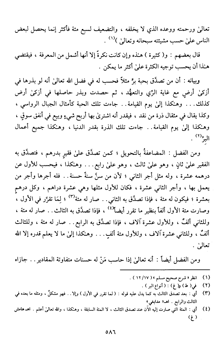 تعالى ورحمته ووعده الذي لا يخلفه، والتضعيف لسبع مئة فأكثر إنما يحصل لبعض الناس على حسب مشيئته سبحانه وتعالى) (¬1).