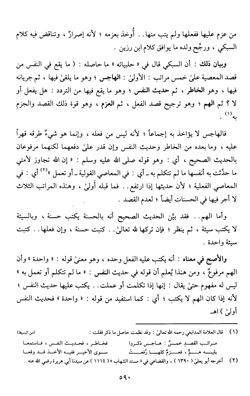 وبيان ذلك: أن السبكي قال في "حلبياته" ما حاصله: (ما يقع في النفس من قصد المعصية على خمس مراتب: الأولى: الهاجس؛ وهو ما يلقى فيها، ثم جريانه فيها، وهو الخاطر، ثم حديث النفس؛ وهو ما يقع فيها من التردد: هل يفعل أو لا؟ ثم الهم؛ وهو ترجيح قصد الفعل، ثم العزم، وهو قوة ذلك القصد والجزم به (¬1).