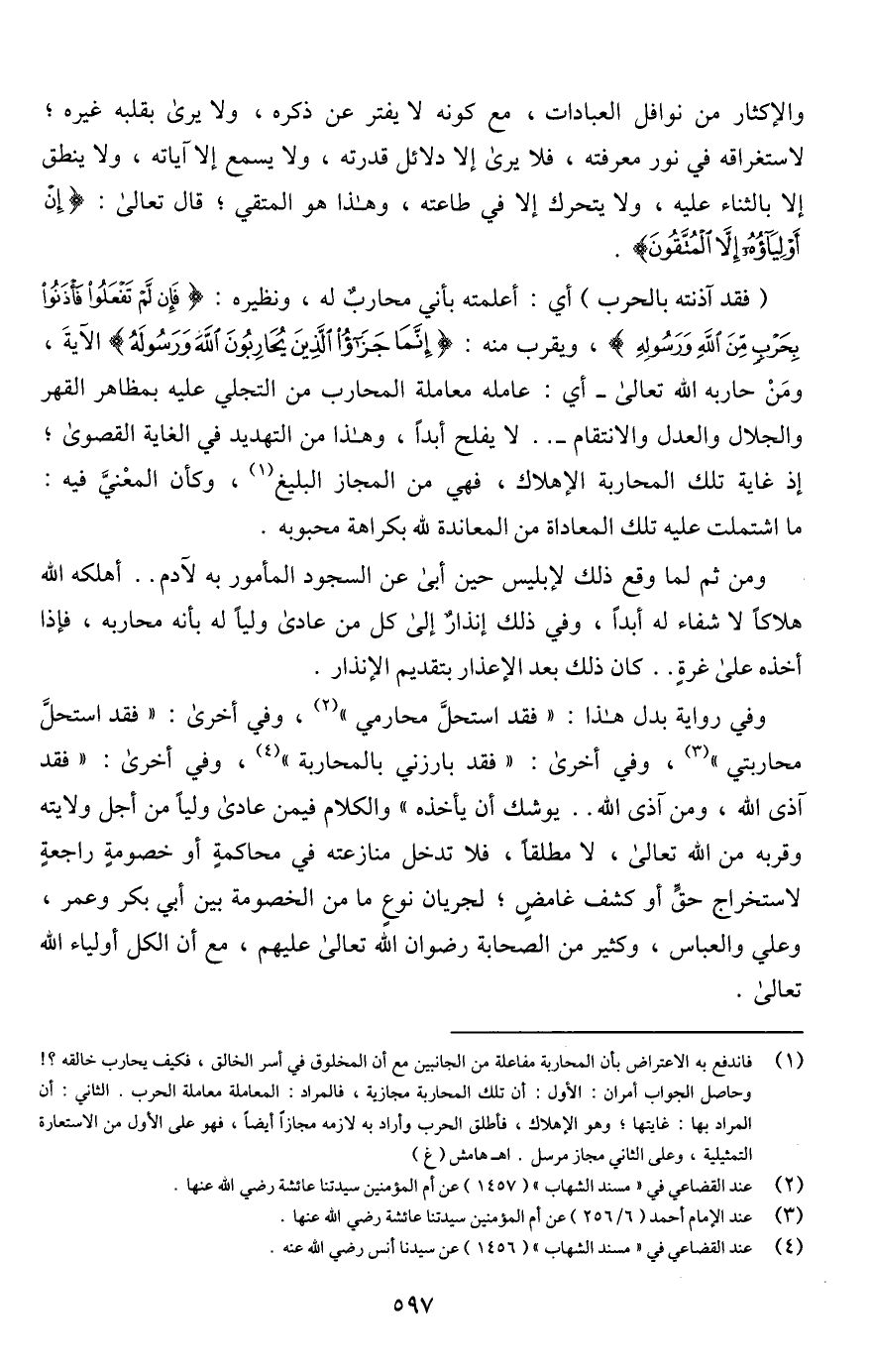 وفي رواية بدل هذا: "فقد استحلَّ محارمي" (¬2)، وفي أخرى: "فقد استحلَّ محاربتي" (¬3)، وفي أخرى: "فقد بارزني بالمحاربة" (¬4)، وفي أخرى: "فقد آذى اللَّه، ومن آذى اللَّه. . يوشك أن يأخذه" والكلام فيمن عادى وليًا من أجل ولايته وقربه من اللَّه تعالى، لا مطلقًا، فلا تدخل منازعته في محاكمةٍ أو خصومةٍ راجعةٍ لاستخراج حقٍّ أو كشف غامضٍ؛ لجريان نوعٍ ما من الخصومة بين أبي بكر وعمر، وعلي والعباس، وكثير من الصحابة رضوان اللَّه تعالى عليهم، مع أن الكل أولياء اللَّه تعالى.