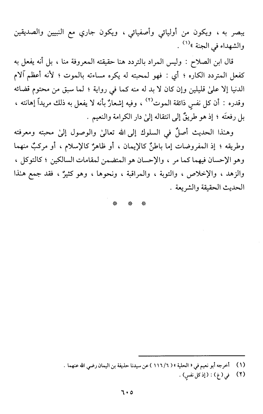 وهذا الحديث أصلٌ في السلوك إلى اللَّه تعالى والوصول إلى محبته ومعرفته وطريقه؛ إذ المفروضات إما باطنٌ كالإيمان، أو ظاهرٌ كالإسلام، أو مركبٌ منهما وهو الإحسان فيهما كما مر، والإحسان هو المتضمن لمقامات السالكين؛ كالتوكل، والزهد، والإخلاص، والتوبة، والمراقبة، ونحوها، وهو كثيرٌ، فقد جمع هذا الحديث الحقيقة والشريعة.