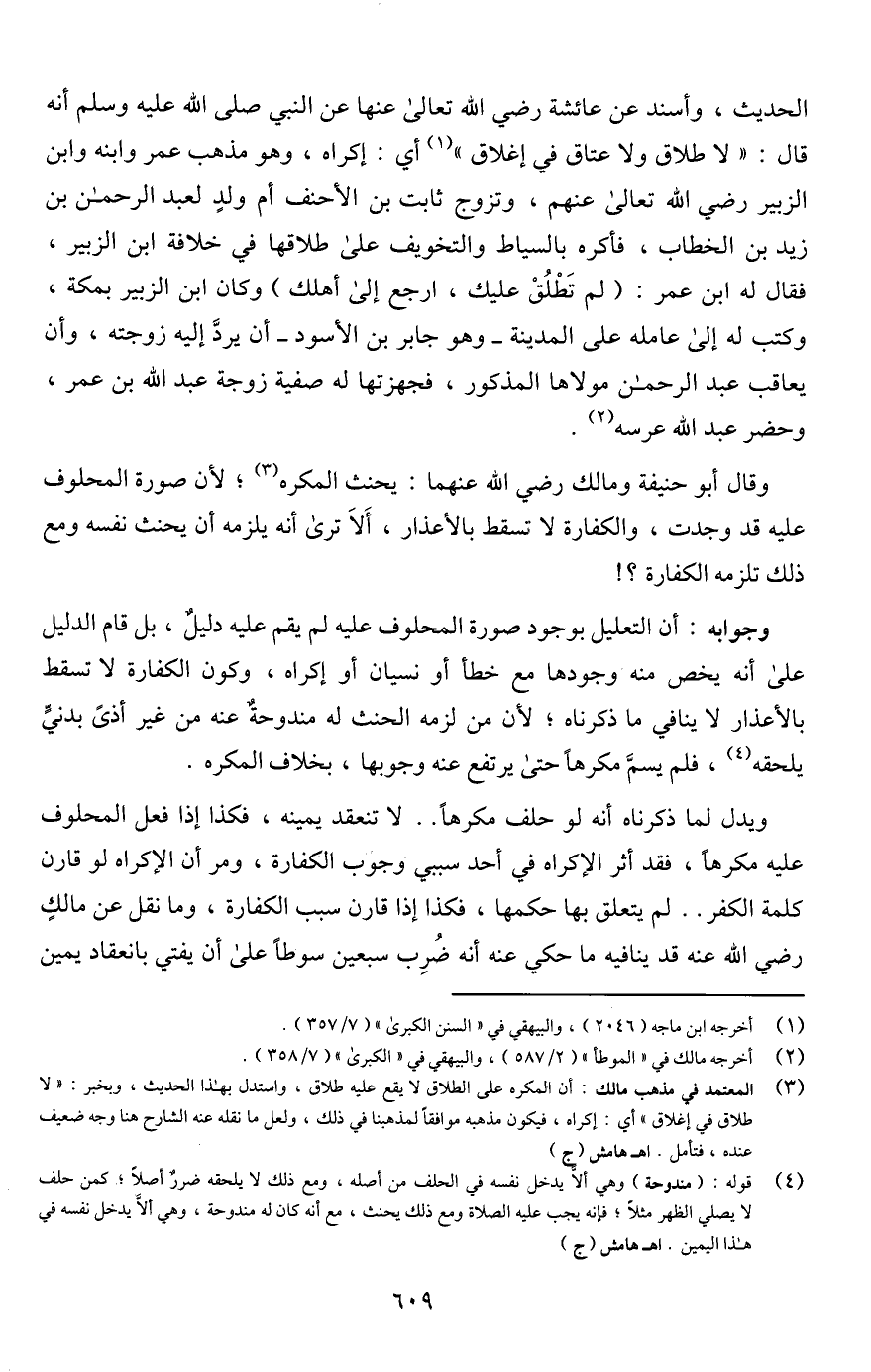 الحديث، وأسند عن عائشة رضي اللَّه تعالى عنها عن النبي صلى اللَّه عليه وسلم أنه قال: "لا طلاق ولا عتاق في إغلاق" (¬1) أي: إكراه، وهو مذهب عمر وابنه وابن الزبير رضي اللَّه تعالى عنهم، وتزوج ثابت بن الأحنف أم ولدٍ لعبد الرحمن بن زيد بن الخطاب، فأكره بالسياط والتخويف على طلاقها في خلافة ابن الزبير، فقال له ابن عمر: (لم تَطْلُقْ عليك، ارجع إلى أهلك) وكان ابن الزبير بمكة، وكتب له إلى عامله على المدينة -وهو جابر بن الأسود- أن يردَّ إليه زوجته، وأن يعاقب عبد الرحمن مولاها المذكور، فجهزتها له صفية زوجة عبد اللَّه بن عمر، وحضر عبد اللَّه عرسه (¬2).
