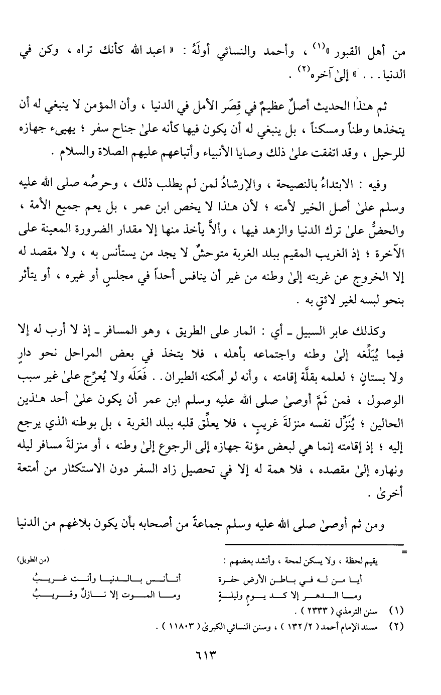 وكذلك عابر السبيل -أي: المار على الطريق، وهو المسافر- إذ لا أرب له إلا فيما يُبَلِّغه إلى وطنه واجتماعه بأهله، فلا يتخذ في بعض المراحل نحو دارٍ ولا بستانٍ؛ لعلمه بقلَّة إقامته، وأنه لو أمكنه الطيران. . فَعَلَه ولا يُعرِّج على غير سبب الوصول، فمن ثَمَّ أوصى صلى اللَّه عليه وسلم ابن عمر أن يكون على أحد هذين الحالين؛ يُنَزِّل نفسه منزلةَ غريبٍ، فلا يعلِّق قلبه ببلد الغربة، بل بوطنه الذي يرجع إليه؛ إذ إقامته إنما هي لبعض مؤنة جهازه إلى الرجوع إلى وطنه، أو منزلةَ مسافر ليله ونهاره إلى مقصده، فلا همة له إلا في تحصيل زاد السفر دون الاستكثار من أمتعة أخرى.
