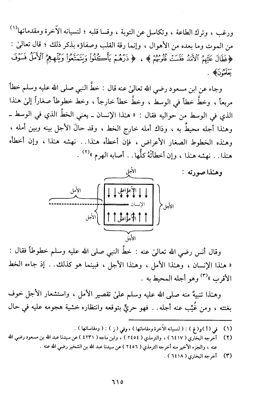 وجاء عن ابن مسعود رضي اللَّه تعالى عنه قال: خطَّ النبي صلى اللَّه عليه وسلم خطًا مربعًا، وخطَّ خطًا في الوسط، وخطَّ خطًا خارجًا، وخط خطوطًا صغارًا إلى هذا الذي في الوسط من حواليه فقال: "هذا الإنسان -يعني الخطَّ الذي في الوسط- وهذا أجله محيطٌ به، وذاك أمله خارج الخط، وقد حالَ الأجل بينه وبين أمله، وهذه المخطوط الصغار الأعراض، فإن أخطأه هذا. . نهشه هذا، وإن أخطأه هذا. . نهشه هذا، وإن أخطأتْهُ كلُّها. . أصابه الهرم" (¬2).