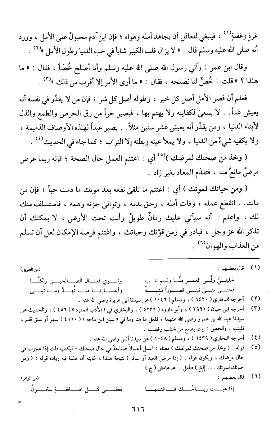 (¬5) قوله: (وخذ من صحتك لمرضك) معناه: اعمل أعمالًا صالحةً في حال صحتك؛ ليكتب ذلك إذا عجزت في حال مرضك، ويكون قوله: (إذا مرض العبد أو سافر) نتيجة هذا، غايته أن هذا فيه زيادة قوله: (ومن حياتك لموتك. . . إلخ) فتأمل. اهـ هامش (ج)