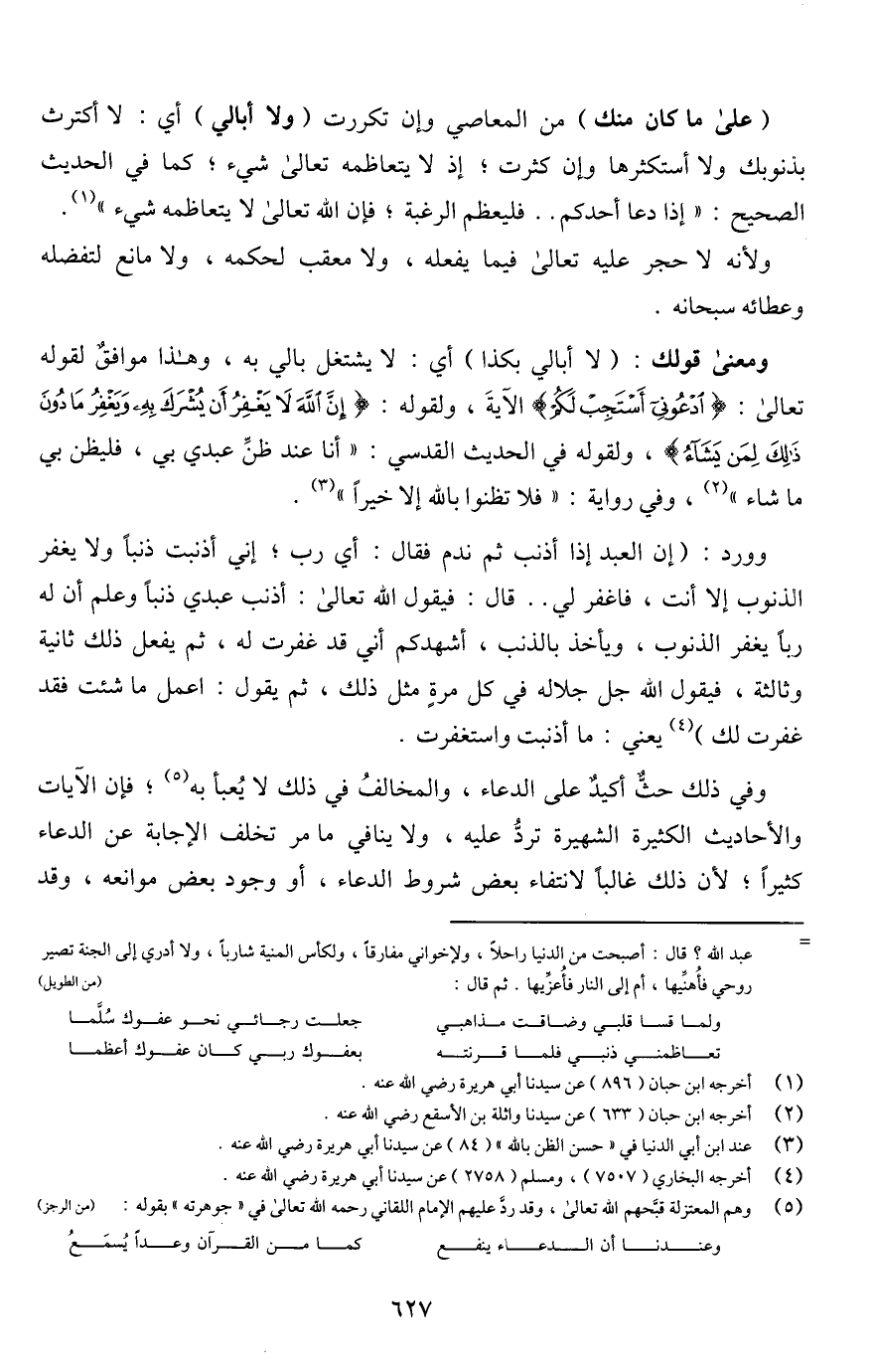 ومعنى قولك: (لا أبالي بكذا) أي: لا يشتغل بالي به، وهذا موافقٌ لقوله تعالى: {وَقَالَ رَبُّكُمُ ادْعُونِي أَسْتَجِبْ لَكُمْ} الآيةَ، ولقوله: {إِنَّ اللَّهَ لَا يَغْفِرُ أَنْ يُشْرَكَ بِهِ وَيَغْفِرُ مَا دُونَ ذَلِكَ لِمَنْ يَشَاءُ}، ولقوله في الحديث القدسي: "أنا عند ظنِّ عبدي بي، فليظن بي ما شاء" (¬2)، وفي رواية: "فلا تظنوا باللَّه إلا خيرًا" (¬3).