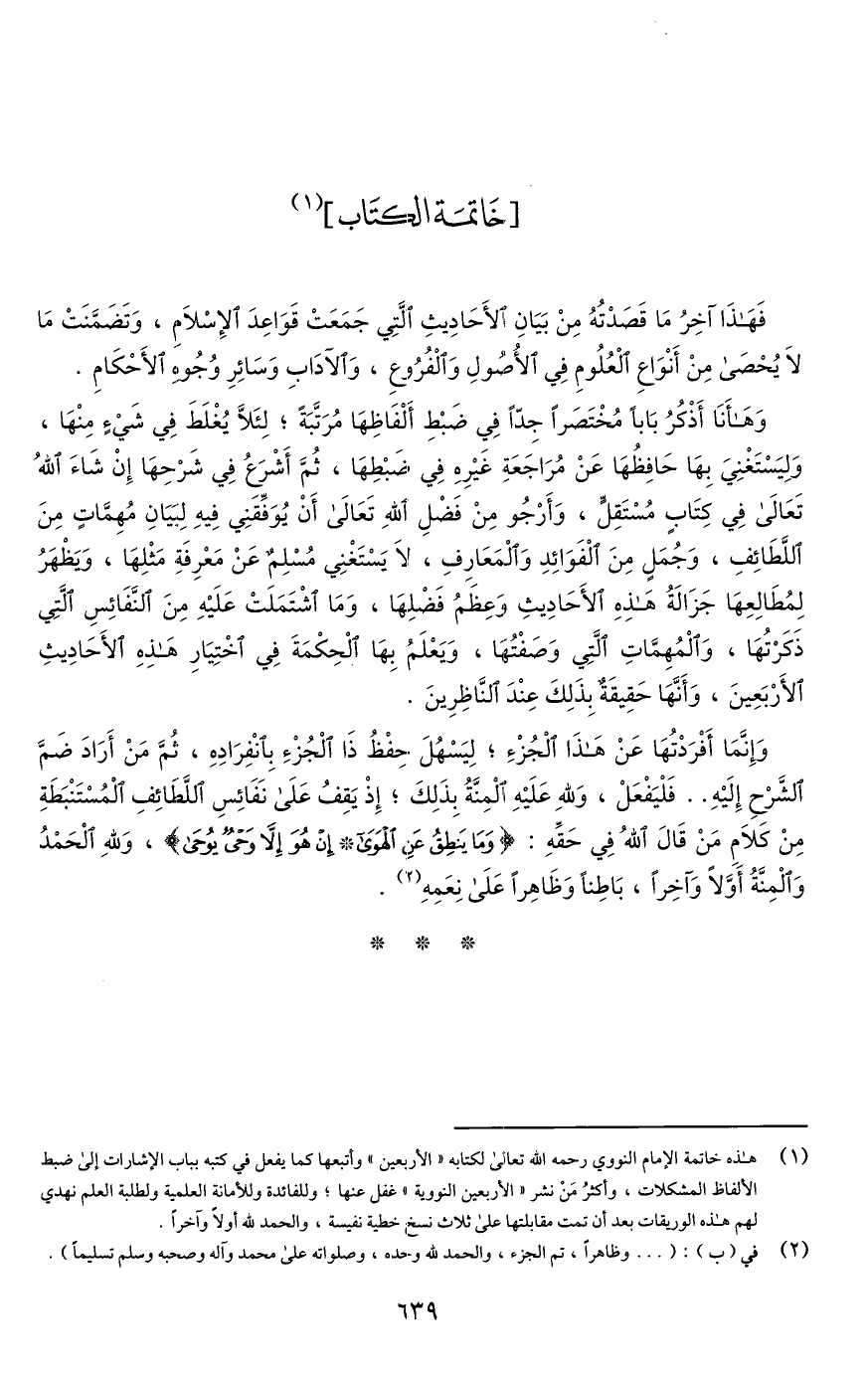 (¬1) هذه خاتمة الإمام النووي رحمه اللَّه تعالى لكتابه "الأربعين" وأتبعها كما يفعل في كتبه بباب الإشارات إلى ضبط الألفاظ المشكلات، وأكثرُ مَنْ نشر "الأربعين النووية" غفل عنها؛ وللفائدة وللأمانة العلمية ولطلبة العلم نهدي لهم هذه الوريقات بعد أن تمت مقابلتها على ثلاث نسخ خطية نفيسة، والحمد للَّه أولًا وآخرًا.