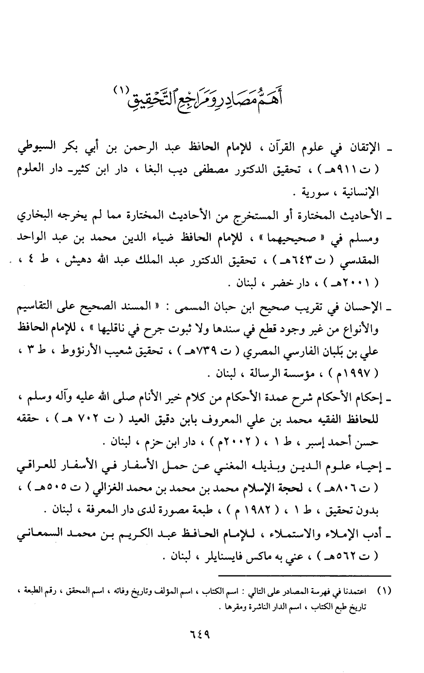 (¬1) اعتمدنا في فهرسة المصادر على التالي: اسم الكتاب، اسم المؤلف وتاريخ وفاته، اسم المحقق، رقم الطبعة، تاريخ طبع الكتاب، اسم الدار الناشرة ومقرها.