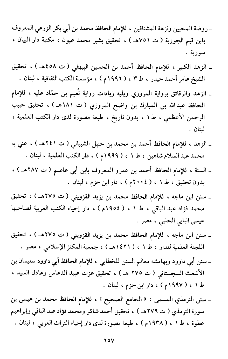 - سنن ابن ماجه، للإمام الحافظ محمد بن يزيد القزويني (ت 275 هـ)، تحقيق اللجنة العلمية للدار، ط 1، (1421 هـ)، جمعية المكنز الإسلامي، مصر.
