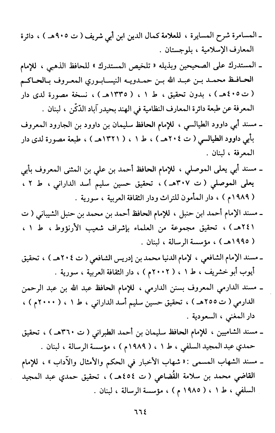 - مسند الشهاب المسمى: "شهاب الأخبار في الحكم والأمثال والآداب"، للإمام القاضي محمد بن سلامة القُضاعي (ت 454 هـ)، تحقيق حمدي عبد المجيد السلفي، ط 1، (1985 م)، مؤسسة الرسالة، لبنان.