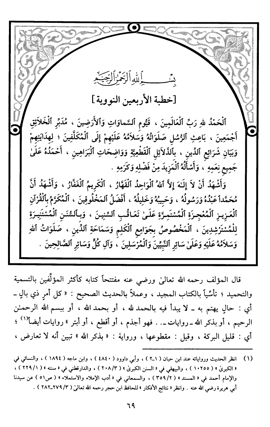 قال المؤلف رحمه اللَّه تعالى ورضي عنه مفتتحًا كتابه كأكثر المؤلِّفين بالتسمية والتحميد؛ تأسِّيًا بالكتاب المجيد، وعملًا بالحديث الصحيح: "كل أمرٍ ذي بالٍ -أي: حالٍ يهتم به- لا يبدأ فيه بالحمد للَّه، أو بحمد اللَّه، أو ببسم اللَّه الرحمن الرحيم، أو بذكر اللَّه -روايات-. . فهو أجذم، أو أقطع، أو أبتر" روايات أيضًا (¬1)؛ أي: قليل البركة، وقيل: مقطوعها، ورواية: "بذكر اللَّه" تبين أنه لا تعارض،