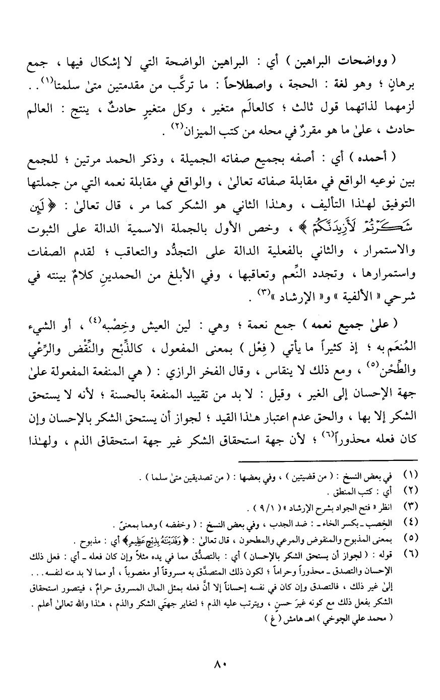(على جميع نعمه) جمع نعمة؛ وهي: بين العيش وخِصْبه (¬4)، أو الشيء المُنعَم به؛ إذ كثيرًا ما يأتي (فِعْل) بمعنى المفعول، كالذِّبْح والنِّقْض والرِّعْي والطِّحْن (¬5)، ومع ذلك لا ينقاس، وقال الفخر الرازي: (هي المنفعة المفعولة على جهة الإحسان إلى الغير، وقيل: لا بد من تقييد المنفعة بالحسنة؛ لأنه لا يستحق الشكر إلا بها، والحق عدم اعتبار هذا القيد؛ لجواز أن يستحق الشكر بالإحسان وإن كان فعله محذورًا (¬6)؛ لأن جهة استحقاق الشكر غير جهة استحقاق الذم، ولهذا