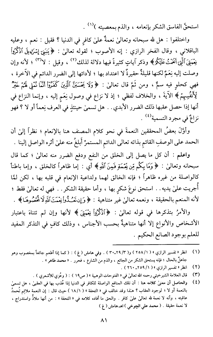 (¬4) والحاصل أن معنى كلامه هنا: أن تلك المنافع الواصلة للكافر في الدنيا إذا عُذب بها في العقبى، هل تسمى بالنعمة أو لا؛ لوجود العقاب؟ هذا وقد خالف في"التحفة" (1/ 18) حيث قال: إن النعمة ملائِم تُحمدُ عاقبته، وأنه لا نعمة للَّه تعالى على كافر. والحق ما أفاده كلامه في "التحفة": من أنها ملاذُّ واستدراج، لا نعمة حقيقة. (محمد علي الجوخي) اهـ هامش (غ).