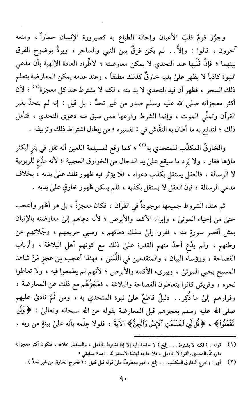 وجوَّز قومٌ قلبَ الأعيان وإحالة الطباع به كصيرورة الإنسان حمارًا، ومنعه آخرون، قالوا: وإلَّا. . لم يكن فرقٌ بين النبي والساحر، ويردُّ بوضوح الفرق بينهما؛ فإنَّ قَلْبها عند التحدي لا يمكن معارضته؛ لاطِّراد العادة الإلهية بأن مدعي النبوة كاذبًا لا يظهر على يديه خارقٌ كذلك مطلقًا، وعند عدمه يمكن المعارضة بتعلم ذلك السحر، فظهر أن قيد اللتحدي لا بد منه، لكنه لا يشترط عند كل معجزة (¬1)؛ لأن أكثر معجزاته صلى اللَّه عليه وسلم صدر من غير تحدٍّ، بل قيل: إنه لم يتحدَّ بغير القرآن وتمنِّي الموت، وإنما الشرط وقوعها ممن سبق منه دعوى التحدي، فتأمل ذلك؛ لتدفع به ما أطال به النقَّاش في "تفسيره" من إبطال اشتراط ذلك وتزييفه.