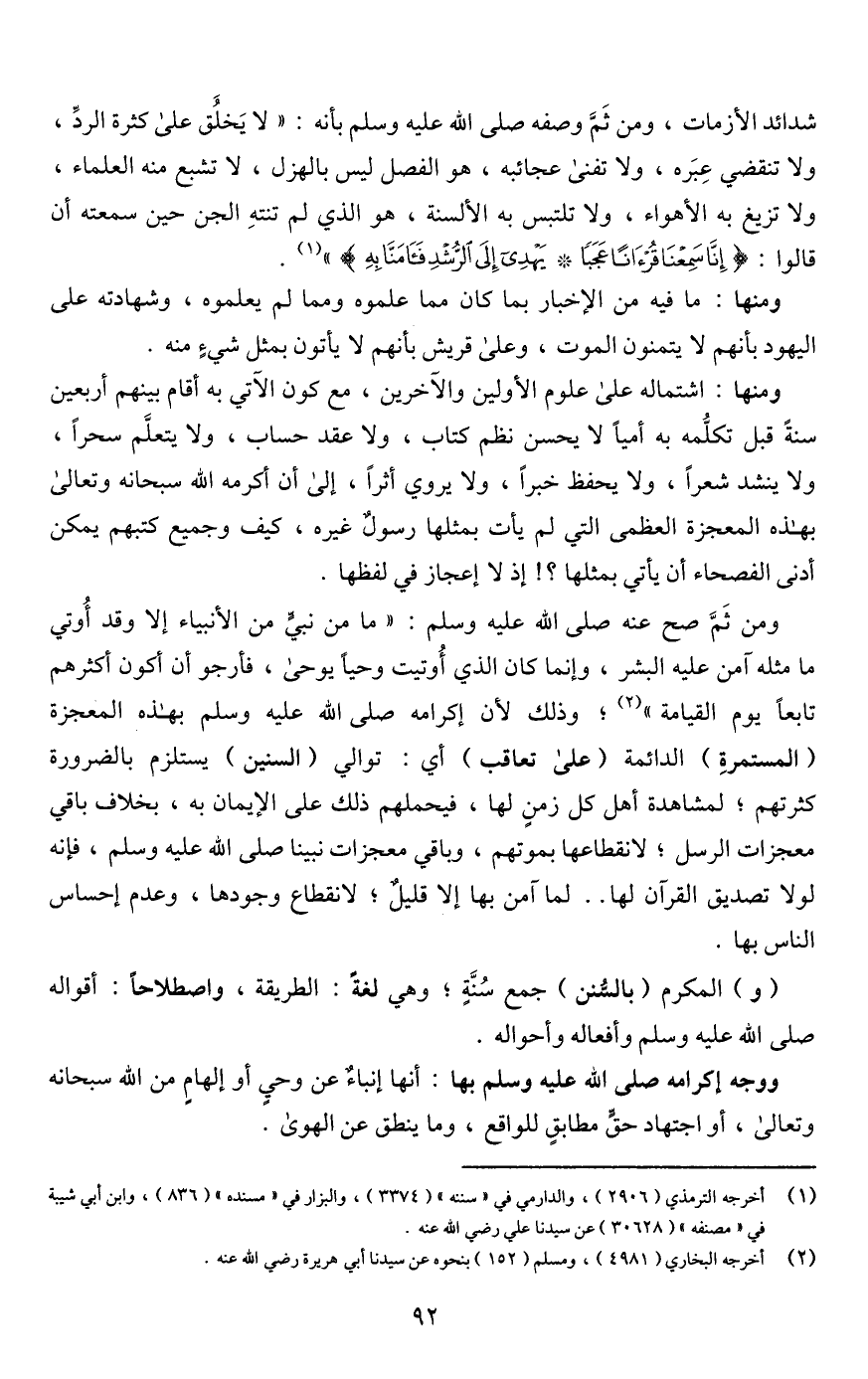 ومنها: اشتماله على علوم الأولين والآخرين، مع كون الآتي به أقام بينهم أربعين سنةً قبل تكلُّمه به أميًا لا يحسن نظم كتاب، ولا عقد حساب، ولا يتعلَّم سحرًا، ولا ينشد شعرًا، ولا يحفظ خبرًا، ولا يروي أثرًا، إلى أن اكرمه اللَّه سبحانه وتعالى بهذه المعجزة العظمى التي لم يأت بمثلها رسولٌ غيره، كيف وجميع كتبهم يمكن أدنى الفصحاء أن يأتي بمثلها؟! إذ لا إعجاز في لفظها.