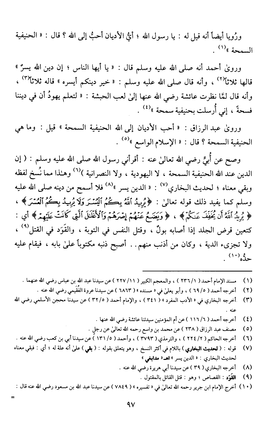 وروى عبد الرزاق: "أحب الأديان إلى اللَّه الحنيفية السمحة" قيل: وما هي الحنيفية السمحة؟ قال: "الإسلام الواسع" (¬5).