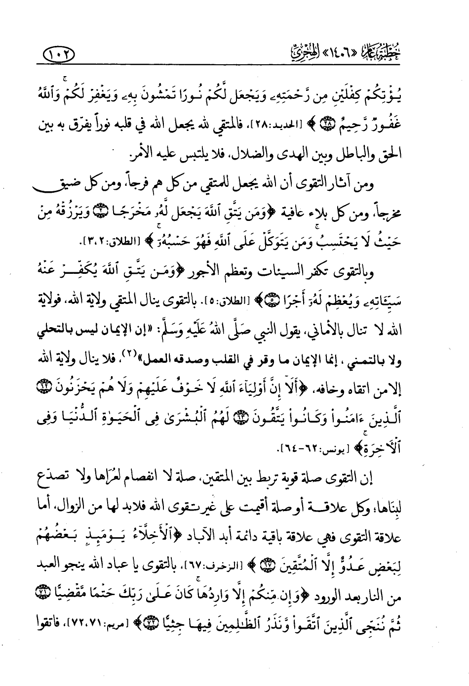 إن التقوى صلة قوية تربط بين المتقين، صلة لا انفصام لعراها ولا تصدع لبناها، وكل علاقة أو صلة أقيمت على غير تقوى الله فلا بد لها من الزوال، أما علاقة التقوى فهي علاقة باقية دائمة أبد الآباد {الْأَخِلَّاءُ يَوْمَئِذٍ بَعْضُهُمْ لِبَعْضٍ عَدُوٌّ إِلَّا الْمُتَّقِينَ} (¬8) بالتقوى يا عباد الله ينجو العبد من النار بعد الورود {وَإِنْ مِنْكُمْ إِلَّا وَارِدُهَا كَانَ عَلَى رَبِّكَ حَتْمًا مَقْضِيًّا} (¬9) {ثُمَّ نُنَجِّي الَّذِينَ اتَّقَوْا وَنَذَرُ الظَّالِمِينَ فِيهَا جِثِيًّا} (¬10) ، فاتقوا