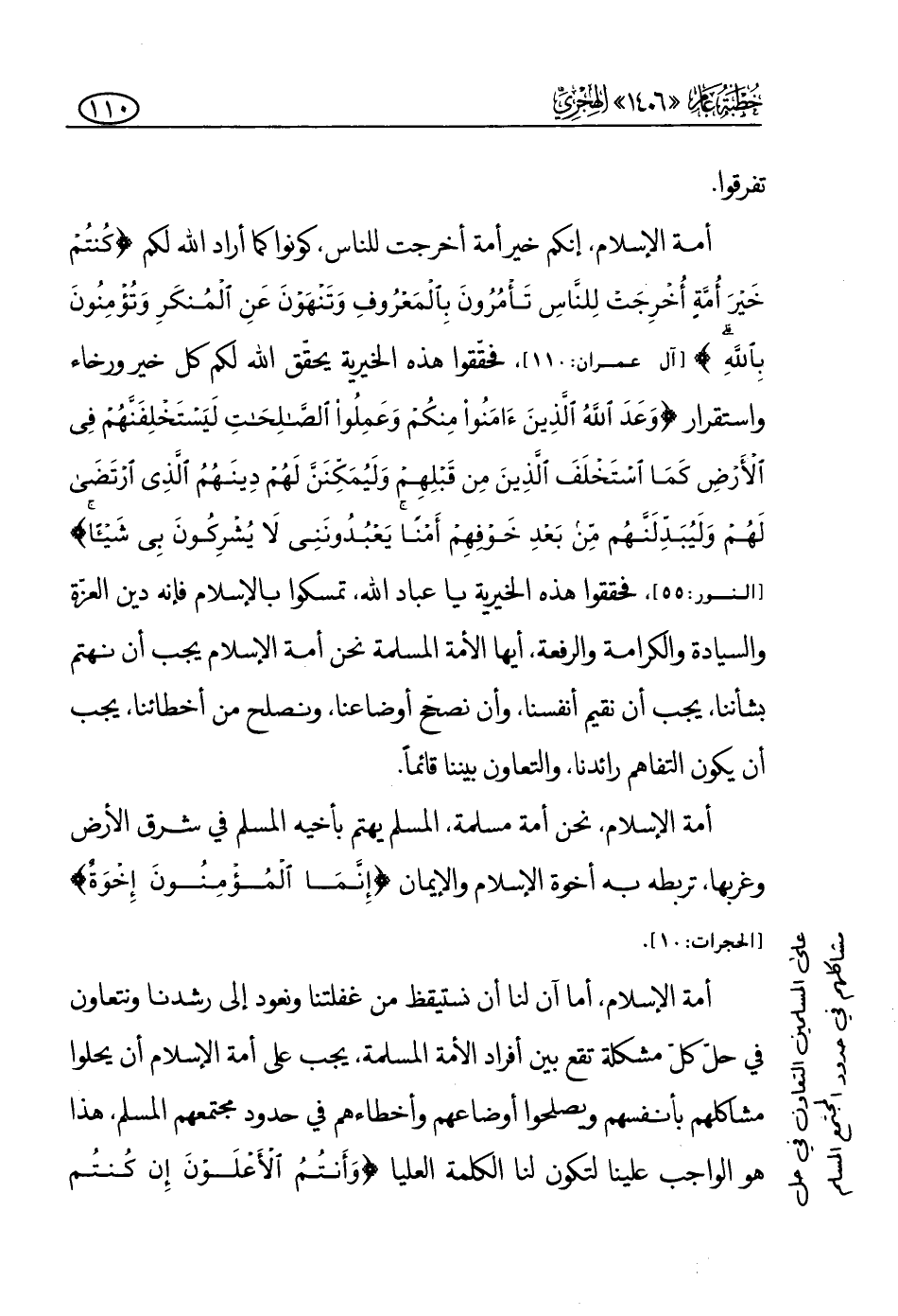أمة الإسلام، أما آن لنا أن نستيقظ من غفلتنا ونعود إلى رشدنا ونتعاون في حل كل مشكلة تقع بين أفراد الأمة المسلمة، يجب على أمة الإسلام أن يحلوا مشاكلهم بأنفسهم، ويصلحوا أوضاعهم وأخطاءهم في حدود مجتمعهم المسلم، هذا هو الواجب علينا لتكون لنا الكلمة العليا {وَأَنْتُمُ الْأَعْلَوْنَ إِنْ كُنْتُمْ مُؤْمِنِينَ} (¬4) .