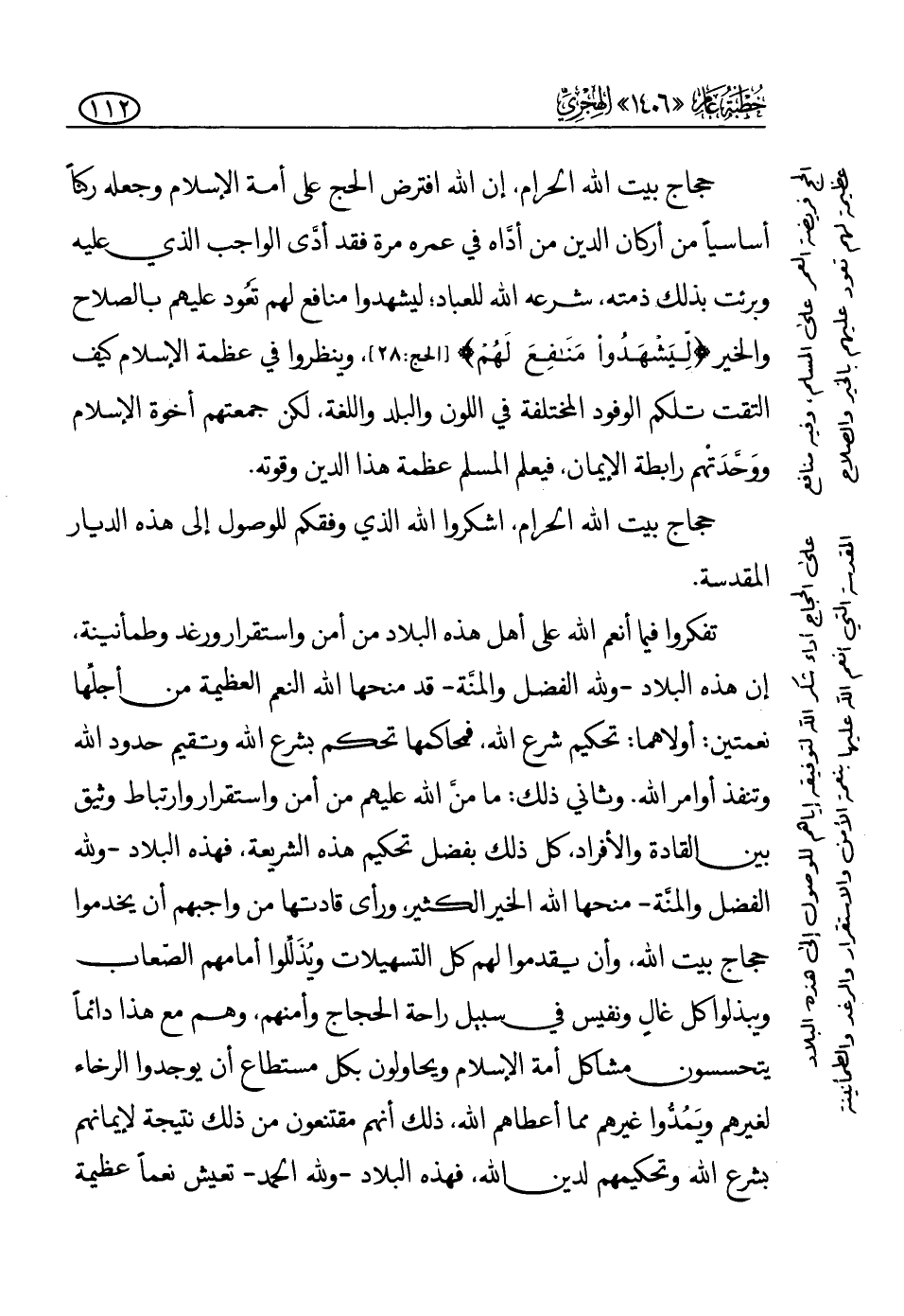 “ على الحجاج أداء شكر الله بتوفيقه إياهم للوصول إلى هذه البلاد المقدسة التي أنعم الله عليها بنعمة الأمن والاستقرار والرغد والطمأنينة “